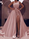 Sparkly Pink A-Line One shoulder Side Slit Long Evening Dresses, Forma