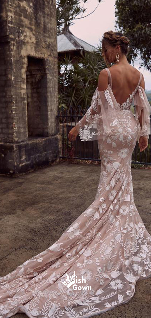 Charming Dusty Pink V-back Mermaid Applique Lace Long Wedding Dresses WDH010