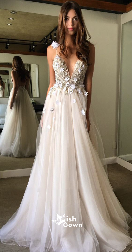 Elegant White V-neck Beads Tulle Long Wedding Dress, WDH077