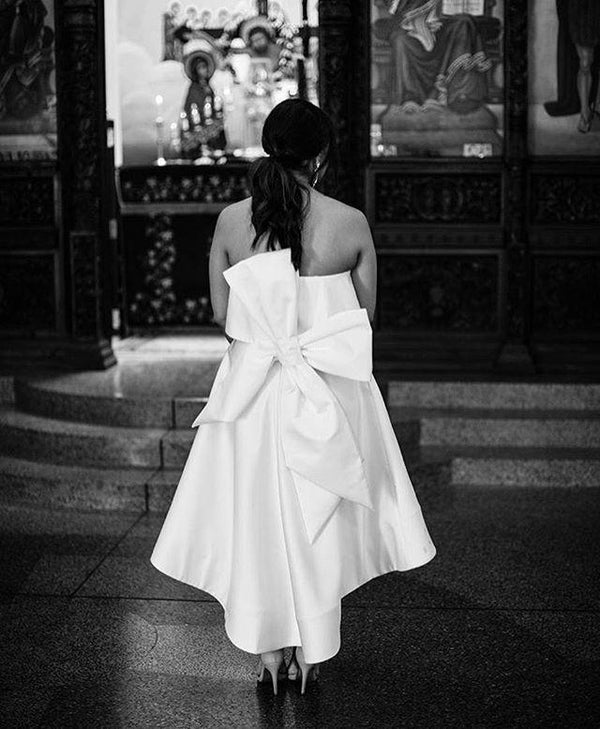 Pink White Satin Bowknot Strapless A-line Short Front Long Back Wedding Party Wedding Guest Dresses Bridesmaid Dresses, WGM029