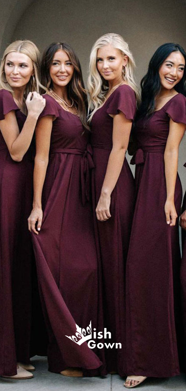 Square Collar Burgundy Short Sleeves High Waist A-line Long Bridesmaid Dresses, WGM021
