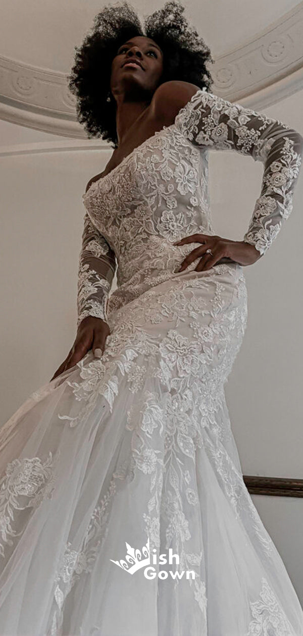 Ivory Lace Off Shoulder Long Sleeves Appliques Mermaid Bridal Gown Wedding Dress, WGB008