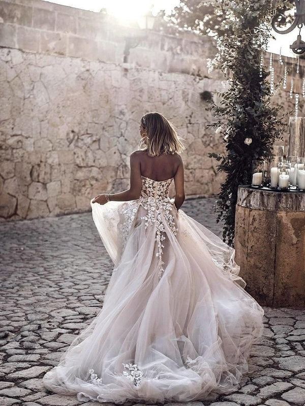 Sweetheart Tulle Strapless Appliques A-line Sweep Train Wedding Brides Dresses, WGB023