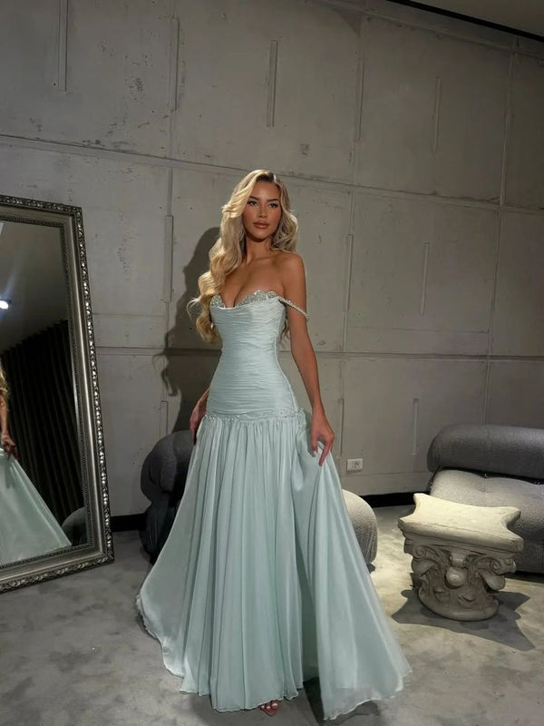 Elegant Green Off-Shoulder A-Line Long Prom Dress Ideas, Evening Party Dresses, WGP1585