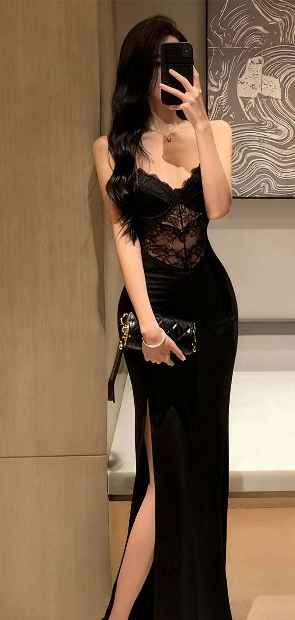 Sexy Black Spaghetti Strap Mermaid Side Slit Lace Long Prom Dress Ideas, Evening Party Dresses , WGP1578