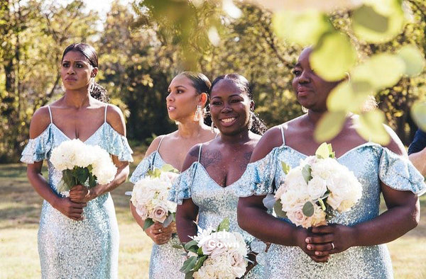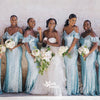 Dusty Blue Sequin Off Shoulder Spaghetti Straps Mermaid Bridesmaid Dresses, WGM049